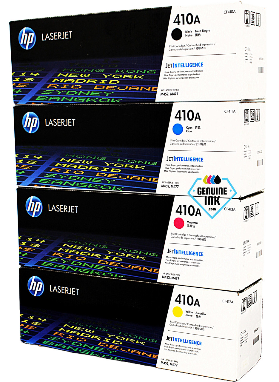 This Original/OEM HP 410A Toner Set is the powerhouse behind many HP color laser printers. This complete set of four HP toner cartridges includes CF410A (Black), CF411A (Cyan), CF412A (Yellow), and CF413A (Magenta).