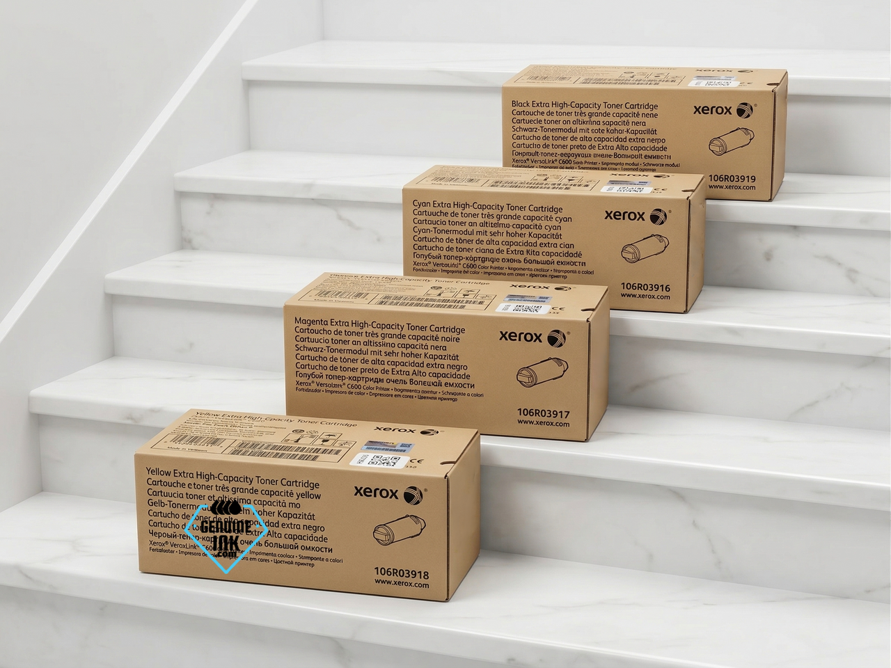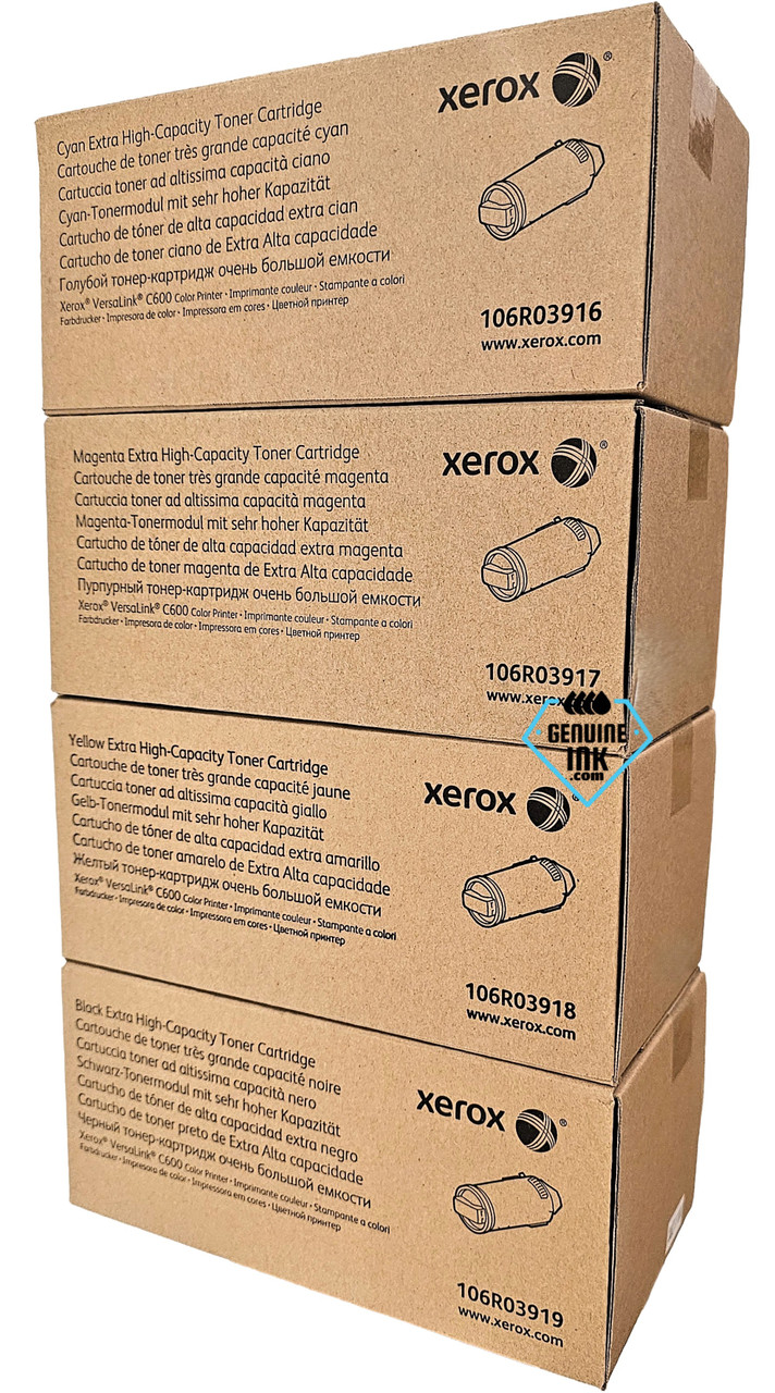 The Original Xerox VersaLink C600 Extra High-Yield Toner Set includes the Xerox Extra High-Yield Cyan (106R03916), Extra High-Yield Magenta (106R03917), Extra High-Yield Yellow (106R03918), and High-Yield Black (106R03919) toner cartridges. It provides reliable, high-quality laser prints with page yields of up to 16,900 pages (Black) and 16,800 pages (Color) at 5% coverage.